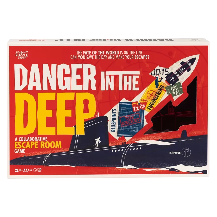 Danger in the Deep is a collaborative escape room game, where players must navigate their way through the engine room, crew’s quarters, mess and control room of a submarine. Only by gathering key information and solving the 14 interactive puzzles will teams be able to disable the warheads, stop PROTEUS, and save the world. The game features puzzle books, cards, secret components, a blueprint, and a working UV torch (batteries included, 3 x AAA).