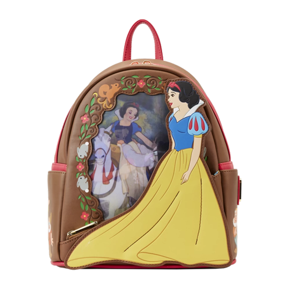 Take a spin around the dance floor and crown yourself the fairest of them all! Loungefly Disney Snow White Lenticular Princess Series Mini Backpack is a real gem, filled with all kinds of unique details. Snow White stands in the foreground on the front of this backpack. Her yellow dress, which softly billows, conceals a diagonal pocket for storing extra items on your travels.