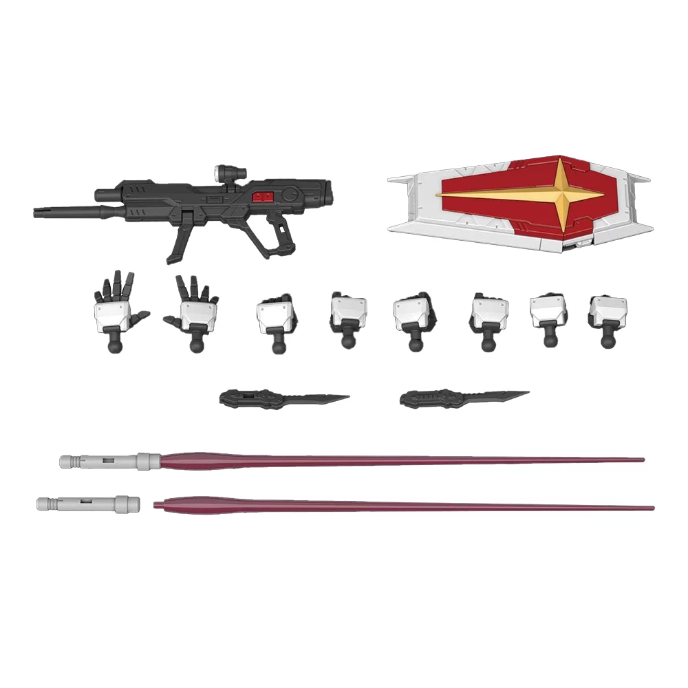 Accessories: High-energy beam rifle x1, mobility shield x1, Vajra beam saber x2, folding razor anti-armor knife x2, silhouette flyer x1, hand parts (left and right) x 4 each, realistic decal x 1