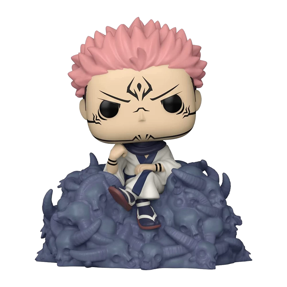 This glow-in-the-dark Deluxe Pop! vinyl figure features Ryomen Sukuna from the anime Jujutsu Kaisen lounging atop a throne of skulls.