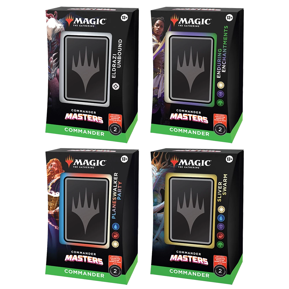 Collect special treatment cards—Each deck comes with a 2-card Collector Booster Sample Pack containing 2 special treatment cards (1 Rare and 1 Rare or Mythic Rare) from the Commander Masters set