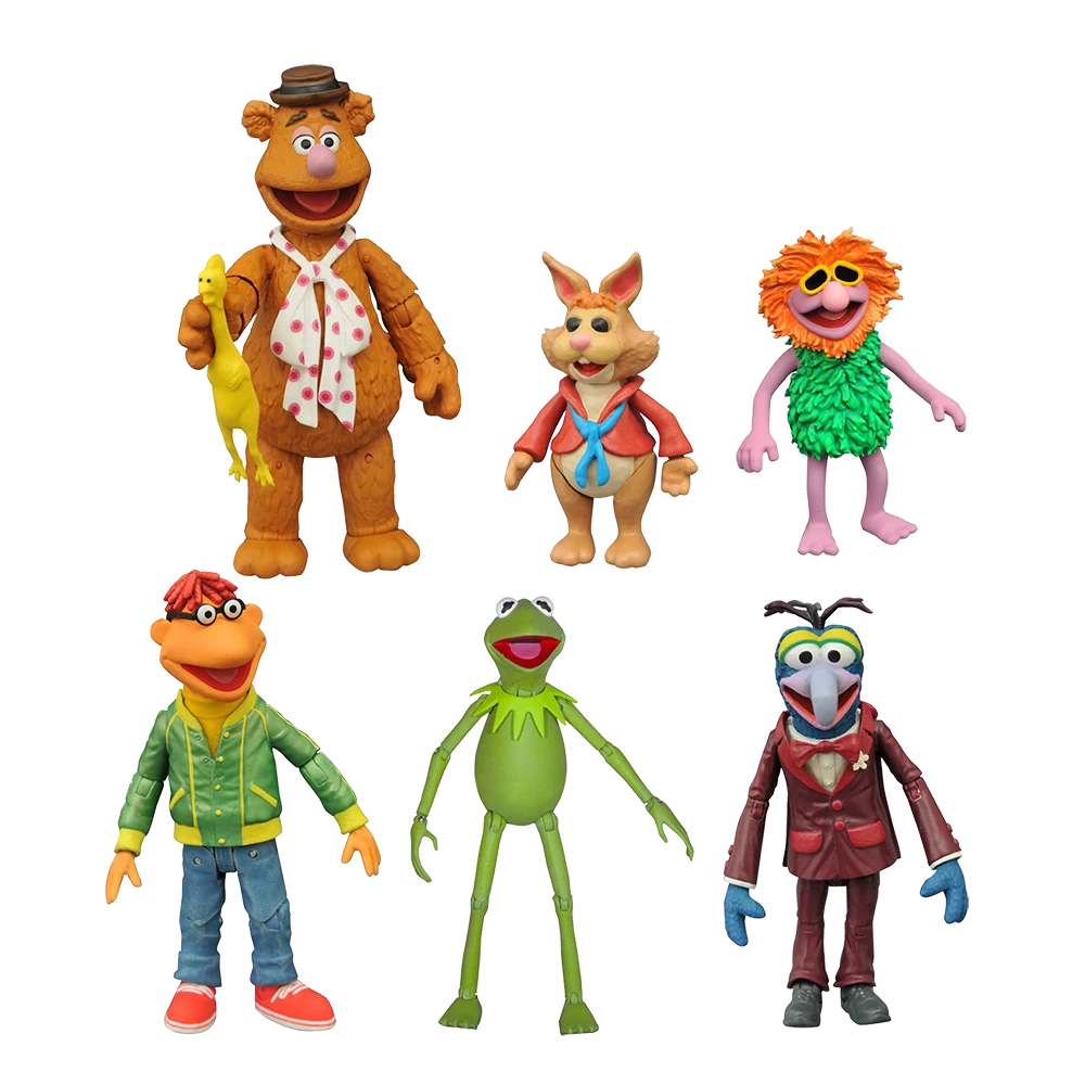 Looking to fill gaps in your Muppets collection, or just give them a place to hang out between shows? Then you need the Muppets Action Figures Backstage Box Set! Made to look like the backstage area of the Muppet Theater, this box set of action figures includes Kermit, Fozzie (with hat), Gonzo, Scooter, Mahna Mahna and Bean Bunny!