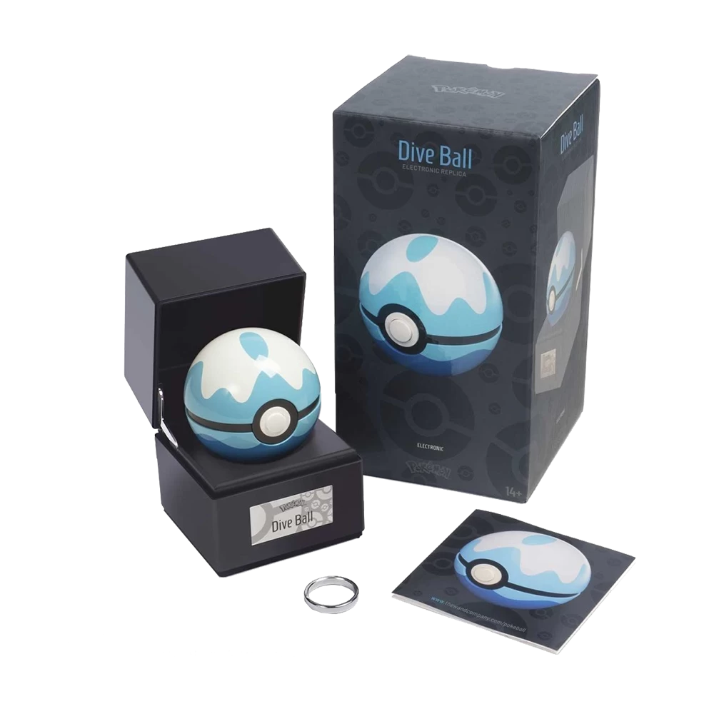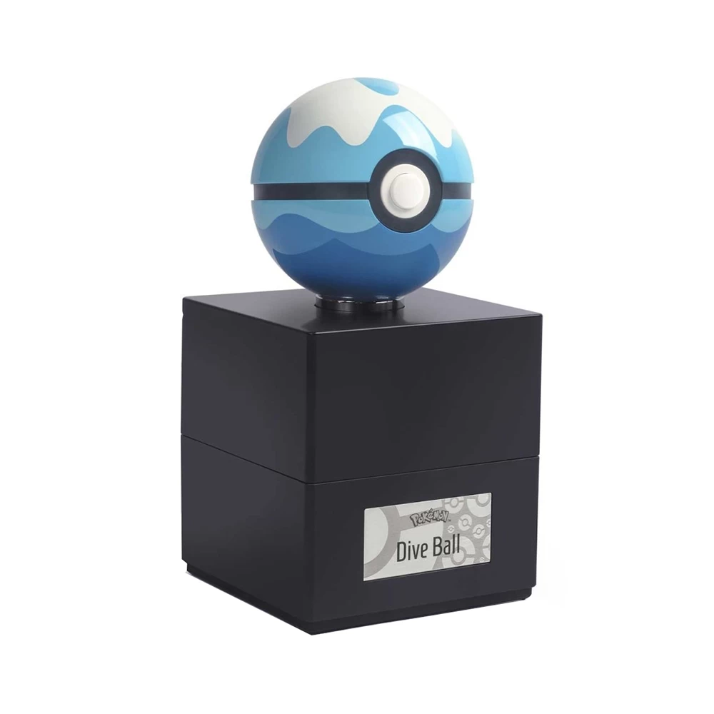 Pressing the center button initiates a Pokémon-catching light sequence, adding an extra touch of realism. This beautiful replica also comes with an illuminated display case along with a display ring if you want to show off the Dive Ball on its own.