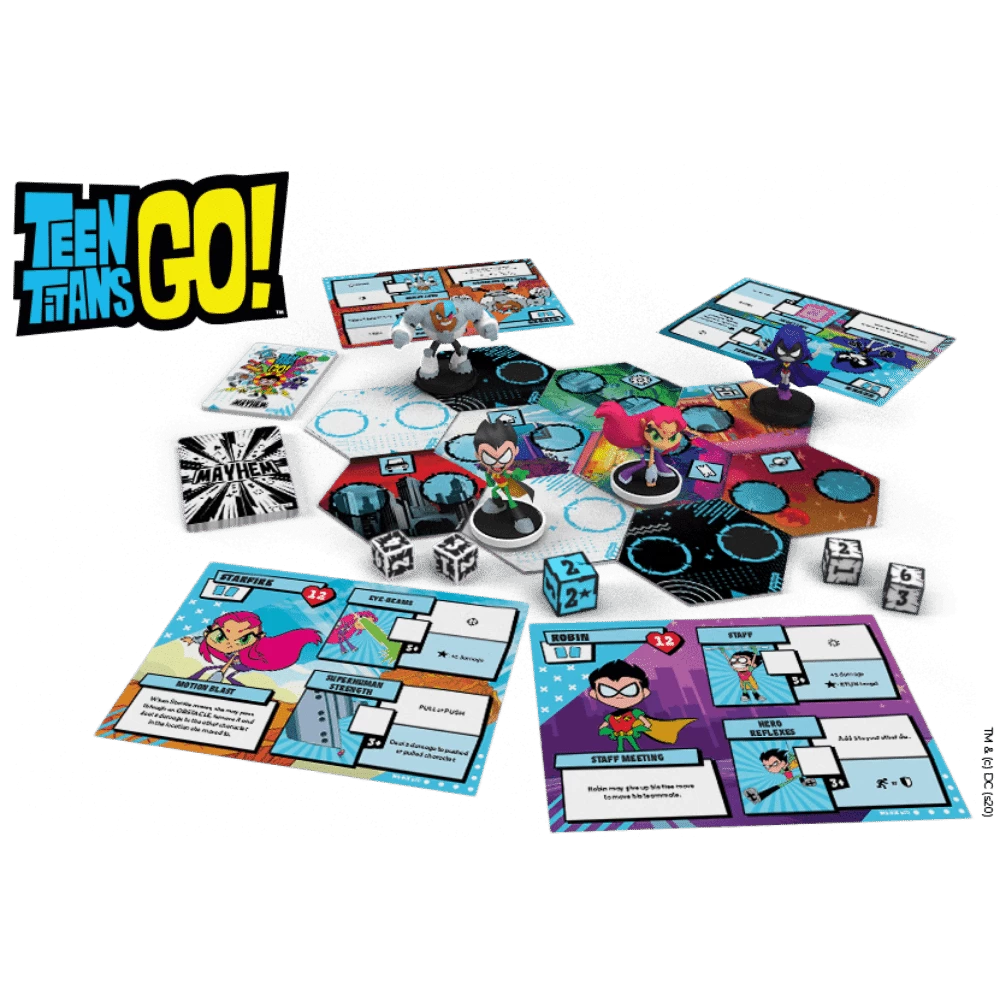 Teen Titans GO! Mayhem is built around the “Mayhem System”, a system for character vs. character team-based combat in which the most direct method for a team to gain VP is by KOing their opponents. Characters use items and powers to battle the enemy team, with battle damage changing each round based on the mayhem die. All of the Titans have a power that directly attacks their opponents, either through an attack or through fire tokens. Fire tokens deal damage equal to the mayhem die, just like a regular attack, but deal their damage at the beginning of each round.