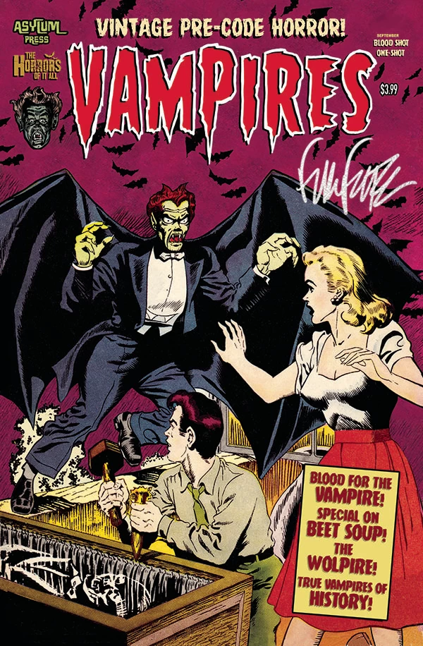 Hot on the bloodied heels of Asylum Press’s horrific hit, Vampires #1, comes this second round of vicious vampiric insanity, as The Horrors of it All’s, Mr. Karswell cracks open another coffin-loaded collection of foul fanged, bat winged terrors from the Golden Age of pre-code comics! Six sinister tales to assault your salivating senses!